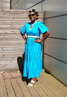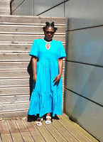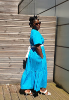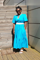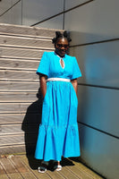 The Rhimes Blue dress is constructed from a cotton fabric. It comes with a generous waist that can be cinch in with a white contrasting belt. Pair with a trainer for a more relaxed look or with a heel/sandal for a more sophisticated look.